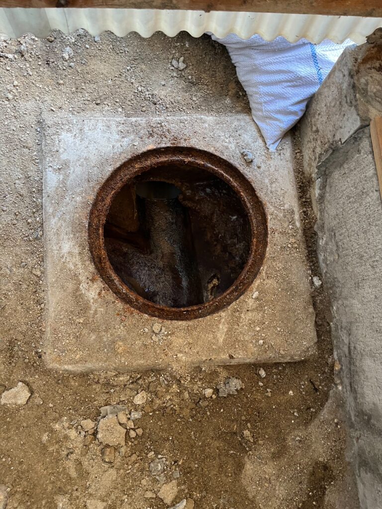 現地で確認すると、排水マスの継ぎ目部分が割れており、そこから排水が地中へ漏れている状態でした。